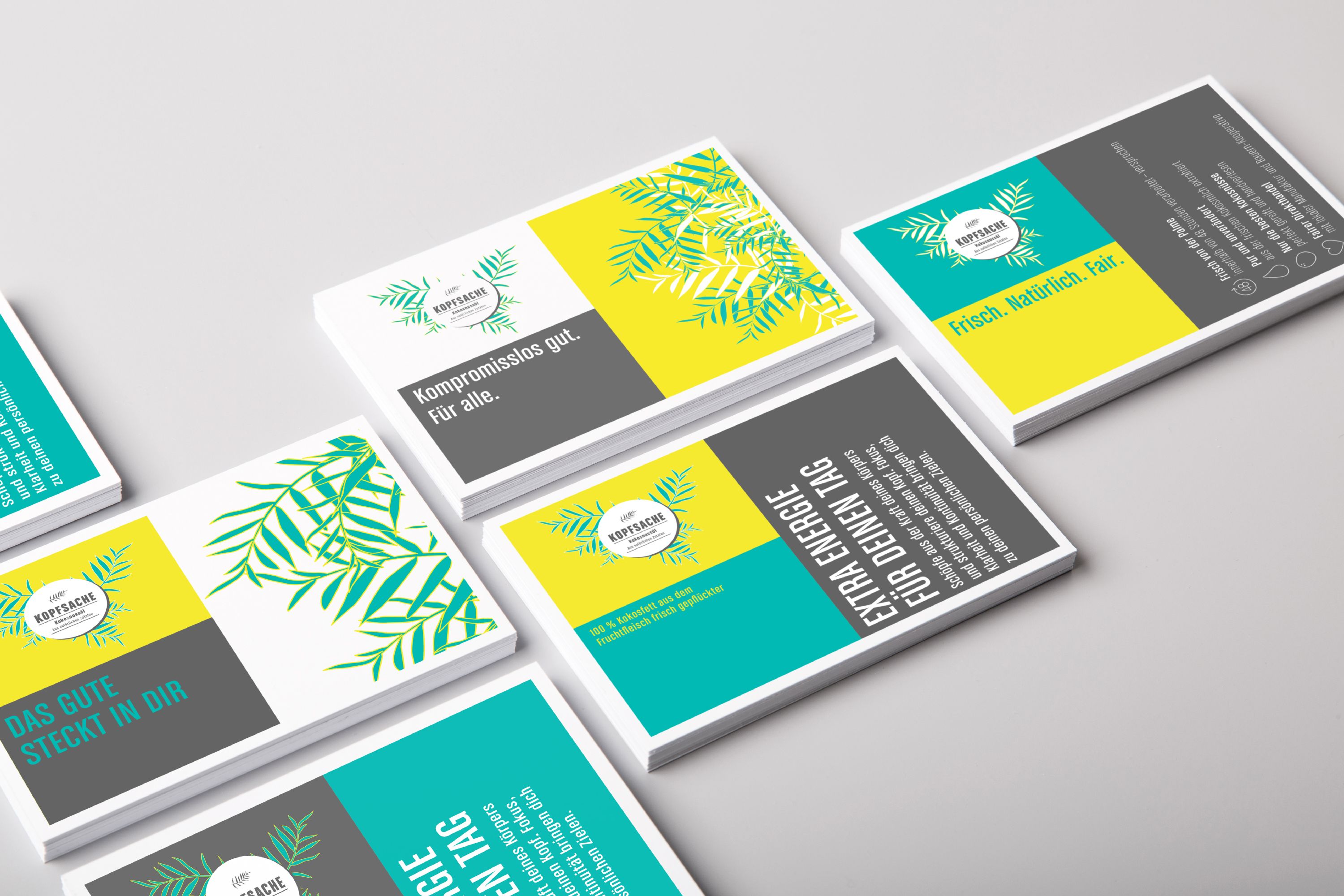 Voor een start-up die nog wil groeien is het belangrijk dat alle vormgevingselementen flexibel kunnen worden ingezet. Bij de ontwikkeling van de identiteit voor Kopfsache stond dit uitgangspunt centraal.